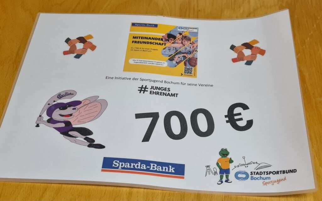 Gute Nachrichten für unsere Jugendabteilung: Unser Projekt „Freundschafts-Banner – Baseball verbindet“ wurde von der Sportjugend Bochum und der Sparda-Bank Bochum als eines der zwölf Förderprojekte ausgewählt und mit 700 € unterstützt.